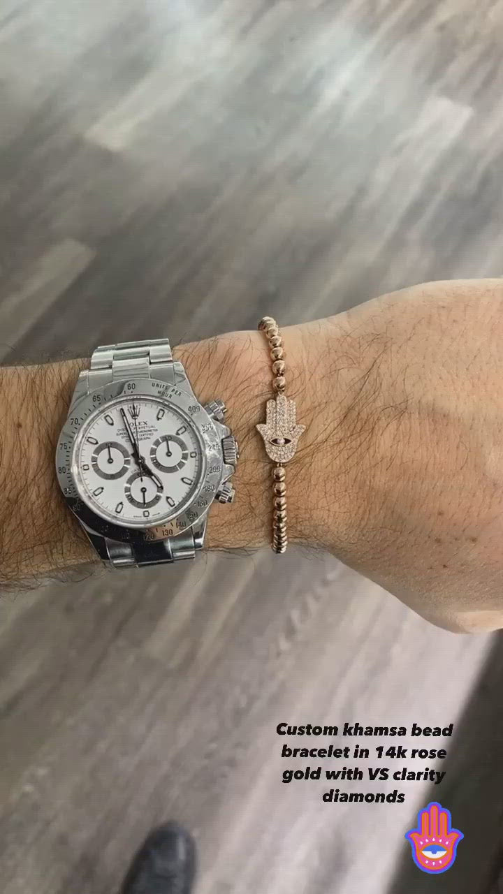 Le bracelet Hamsa perlé est disponible en or blanc et en or jaune.