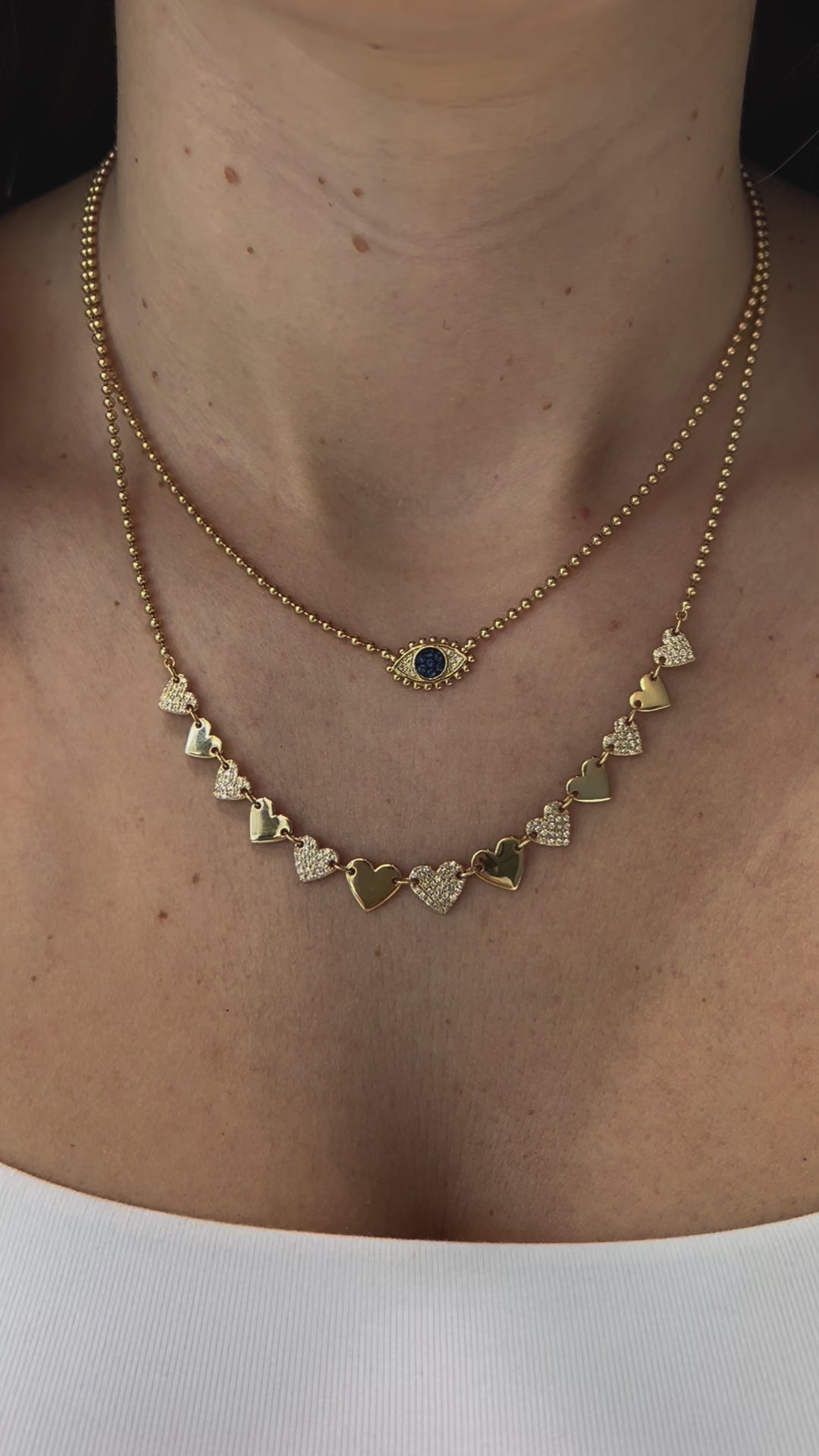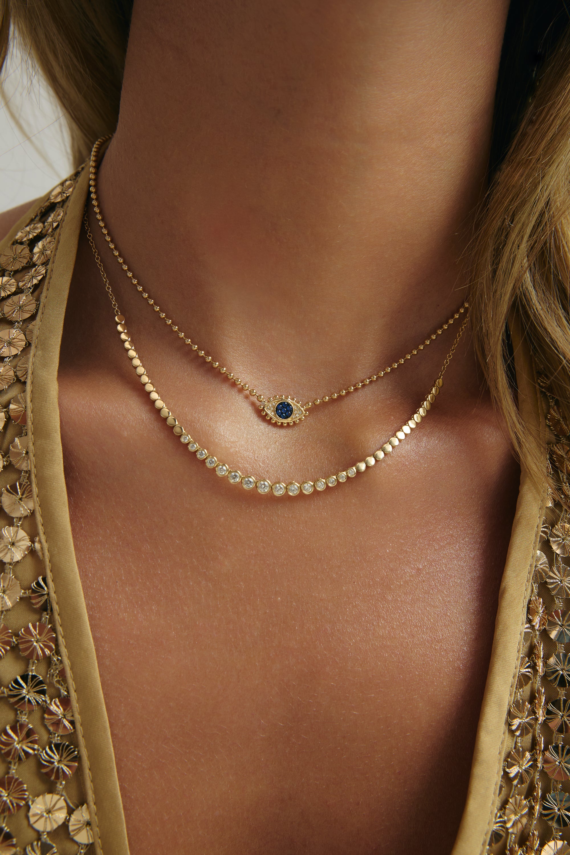 The Diamond Sapphire Evil Eye Beaded Necklace is available in White, and Yellow Gold