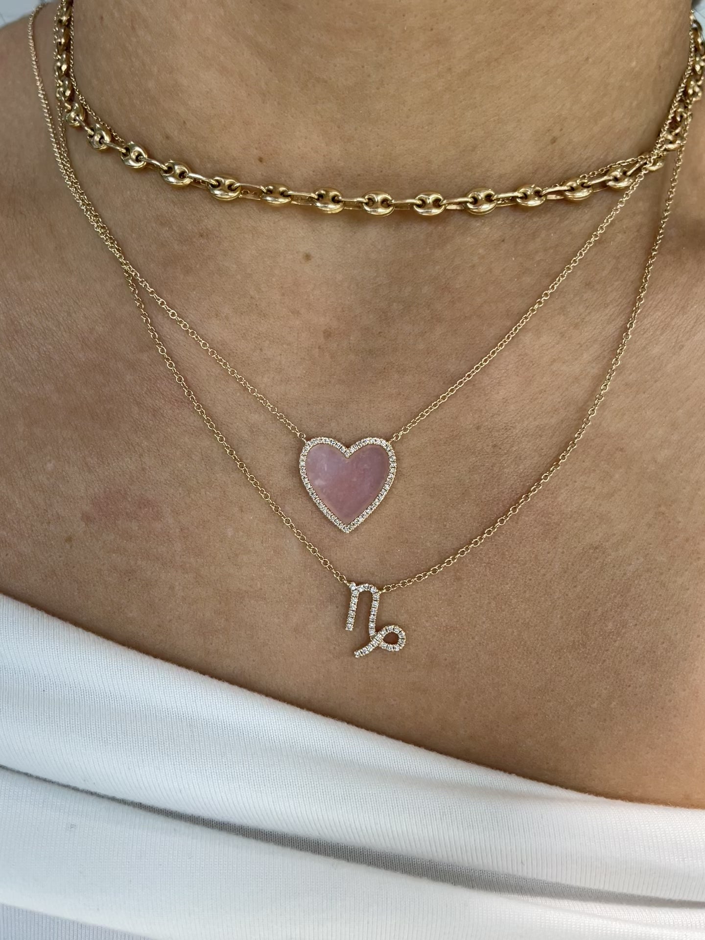 The Pink Opal Diamond Border Heart Necklace is available in White, Yellow and Rose Gold.