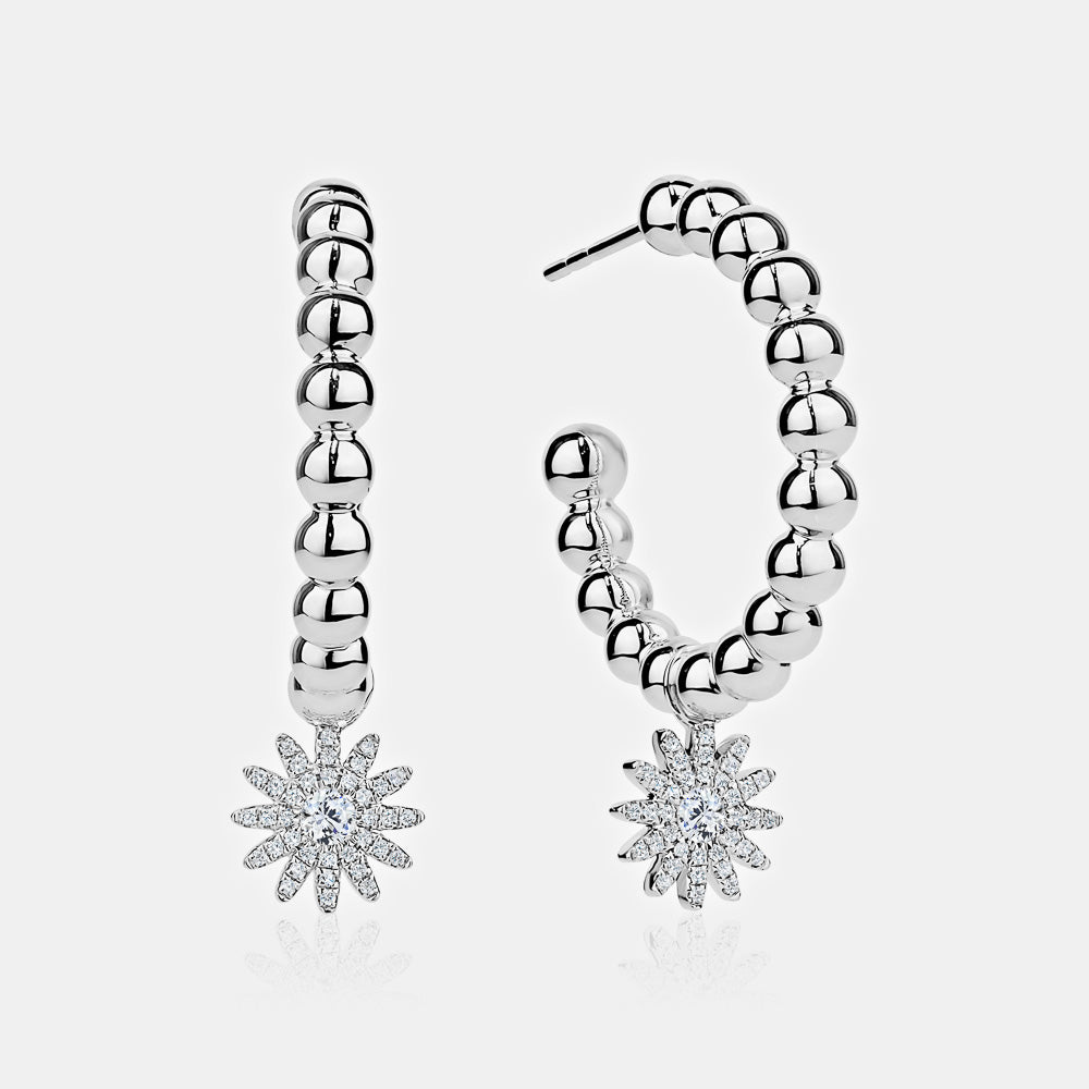 The Diamond Sunburst Beaded Hoop Earrings are available in White, Yellow and Rose Gold.